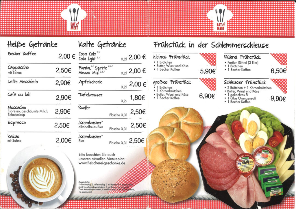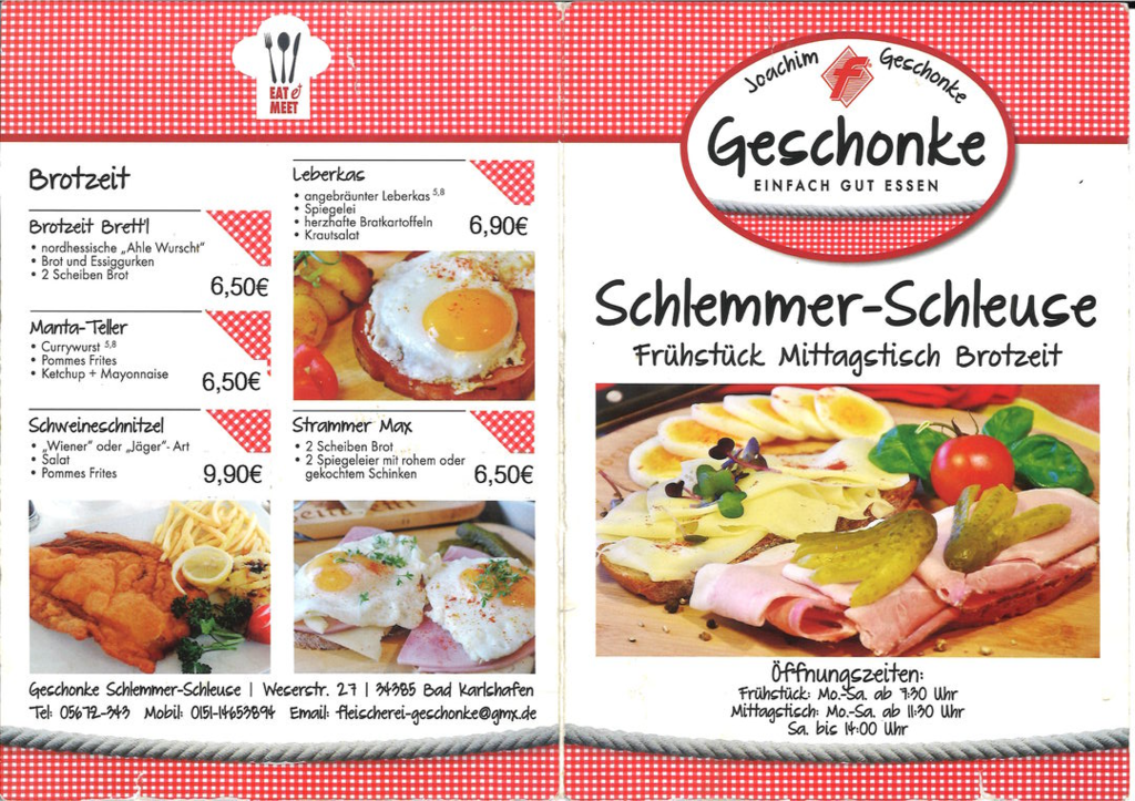 Am 21.06.2018 eröffneten wir in Bad Karlshafen, direkt neben unserem Fleischereifachgeschäft unser Bistro "Schlemmerschleuse". Zu unseren gewohnten Öffnungszeiten warten dort täglich wechselnde Mittagstische, mit Salatbuffet und verschiedene Tagesangebote auf Sie!